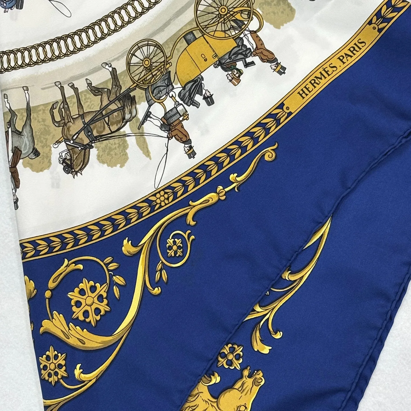 このスカーフには、エルメスの歴史を象徴する馬車のデザインが施されています♬