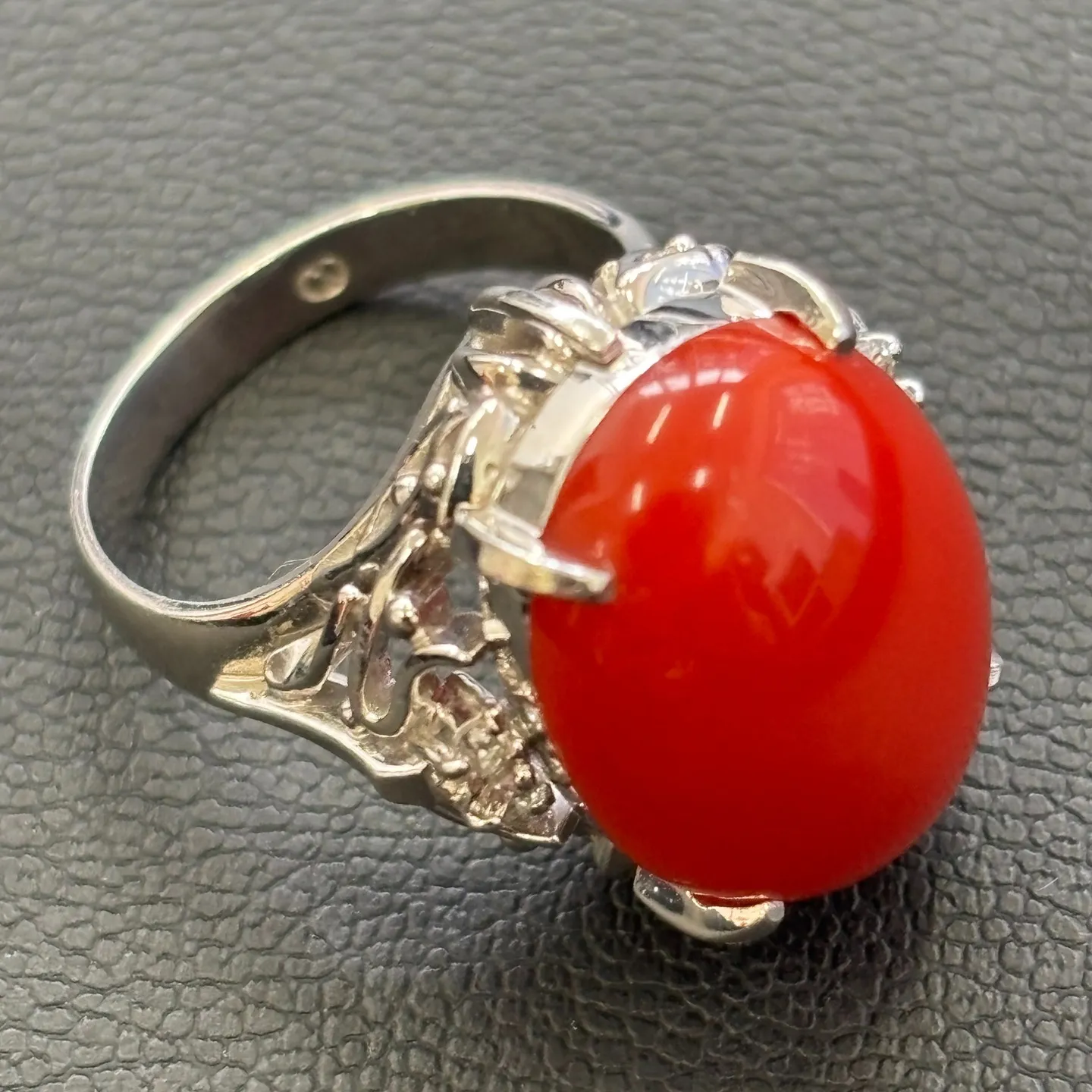 石を支える台座には美しい彫刻が施されており、職人のこだわりを感じます。特に、深く鮮やかな赤色が一際目を引き、まるで宝石そのものが生きているかのように美しく輝いています♬