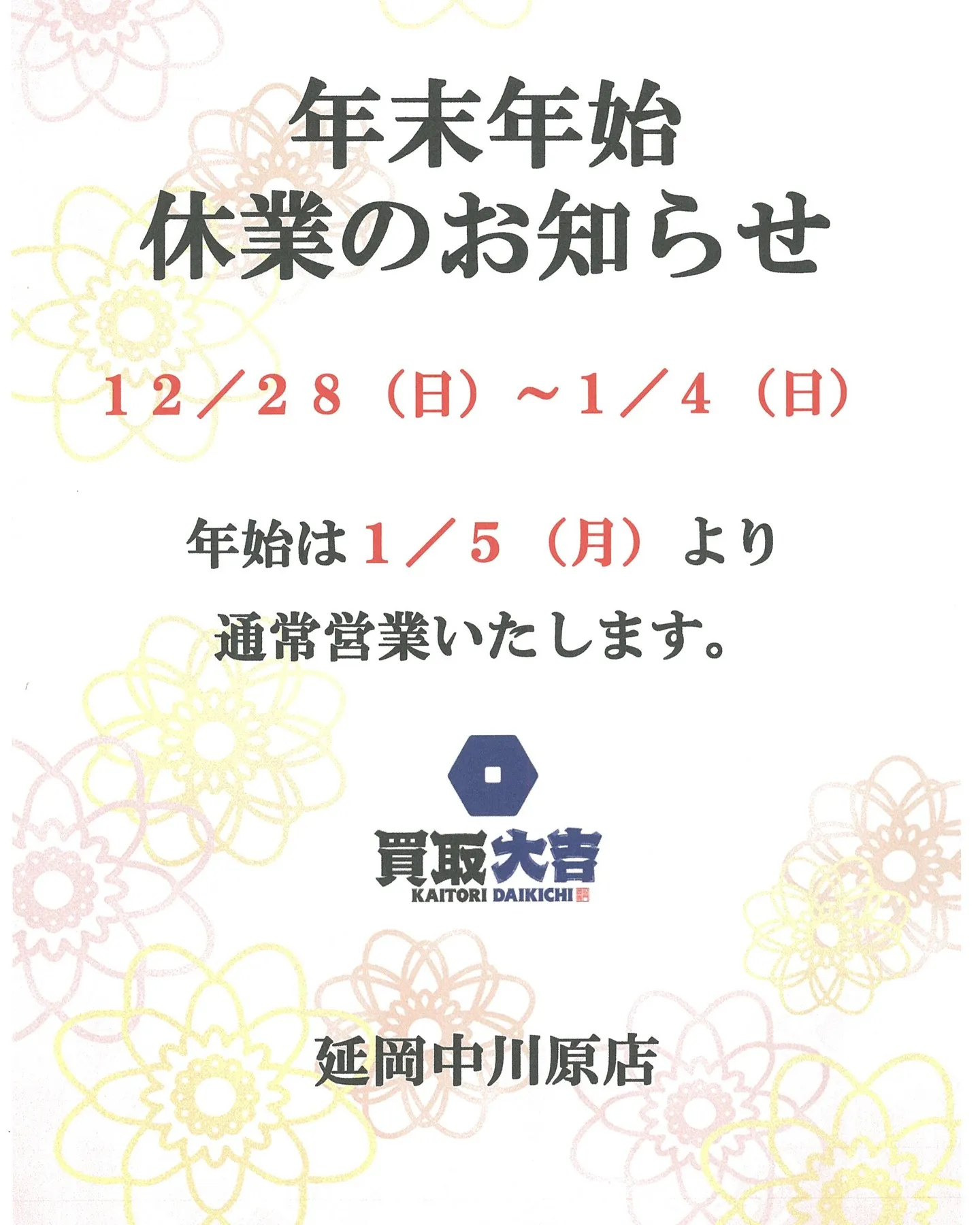年始は1月5日(月)より通常営業いたします。どうぞよろしくお願いいたします🌸